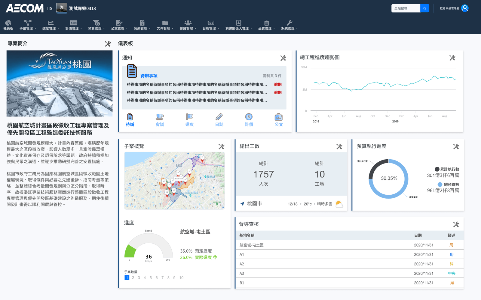 S曲線、施工進度/照片、現場監視畫面、子案說明、BIM模型、連絡表、待辦、會議、缺失追蹤、天氣..