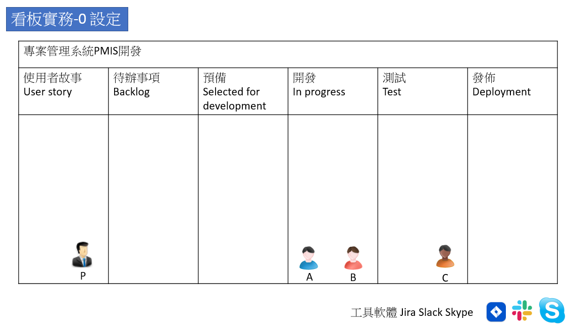 必須先聲明的是,本系列文章所製作的看板實務,是改編一日看板,再加上自己團隊導入後的作法,所以不見得適用所有狀況。在開始之前,基本設定概略說明,團隊有4個人,分別是老闆P,工程師A、B,測試員C。依照團隊以前作業流程,初步規劃看板流程為「使用者故事User story」、「待辦事項Backlog」、「預備Schedule for development」、「開發In progress」、「測試Test」、「發佈Deployment」。(符合看板的4個原則)