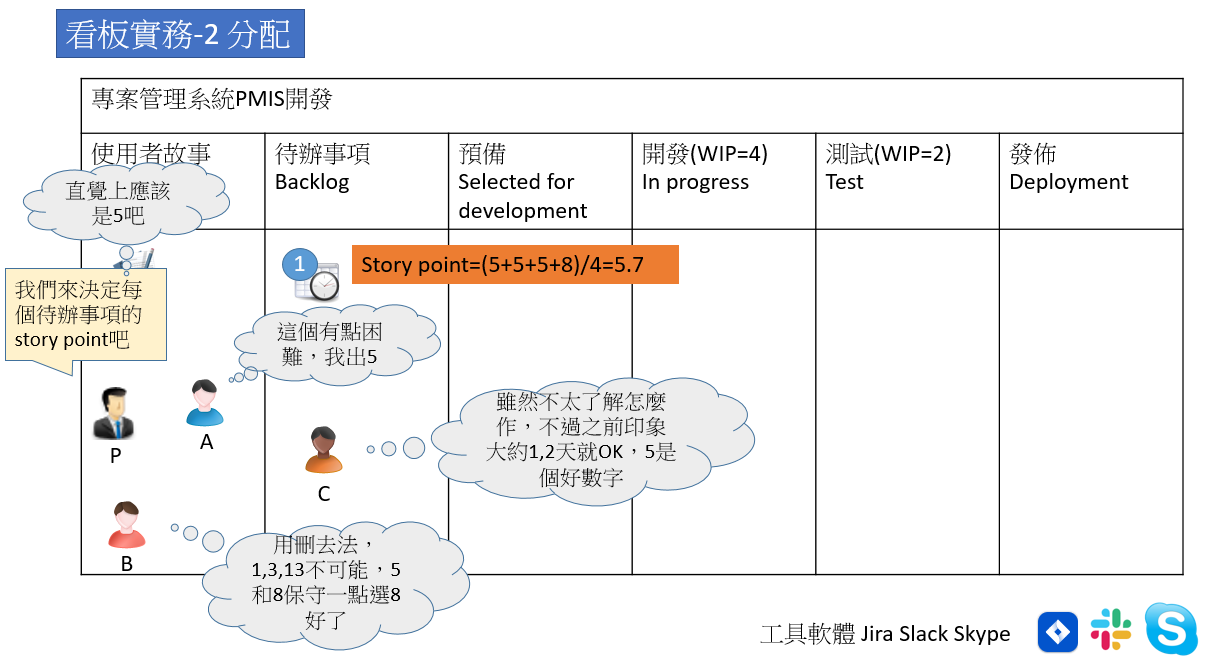 待辦事項指定負責人員後,接著要估算story point。我們是利用費式數列來估算(1,3,5,8,13),是以待辦事項的規模來作評估。這個部份必須說明的是,數字的估算是以完成待辦事項的時間來考量,而不是以完成的困難度,如果沒有事前溝通說明,容易產生誤解。而實務操作上,一開始我們都不限定數字代表之意義,由成員自己定義。而一段時間之後,大家比較了解如何運行,也為了達成彼此共識,數字有了一個較粗略的時間長短定義,1->馬上可以完成,3->需要一點時間,不超過半天,5->較為困難,可能需要1-2天的時間,8->是個大的課題,可能需要2-4天時間,13->沒有把握,還是找資料及多方嘗試,可能需要1周時間才能完成。