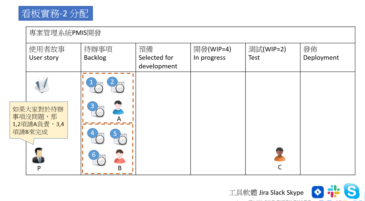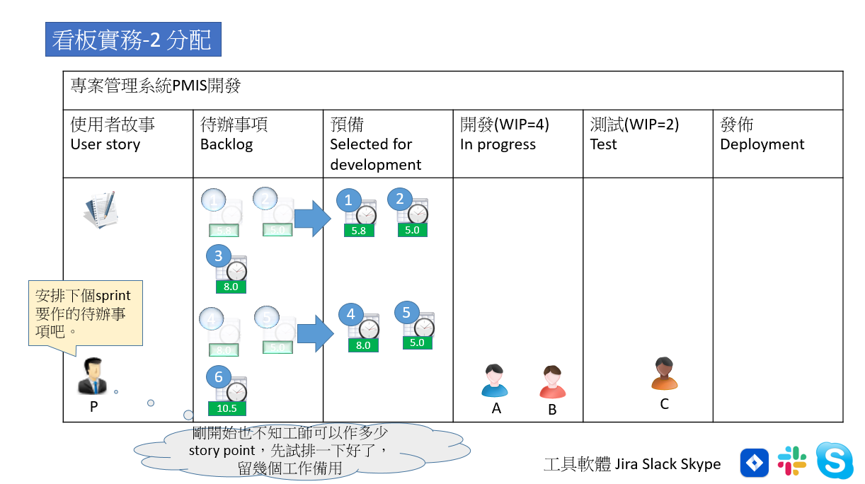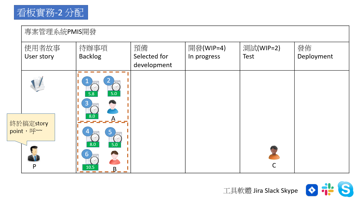 從使用者故事拆分成待辦事項後,要不要指定誰來作,是個問題。一般看板是不指定工程師,由開發人員依序拿取待辦事項進行開發。而SCRUM是要指定每項待辦的負責工程師。我們團隊因為工程師專業不同(前端工程師、介面UI/UX設定),所以工作比較無法彼此支援,所以我們採取指定的方式。